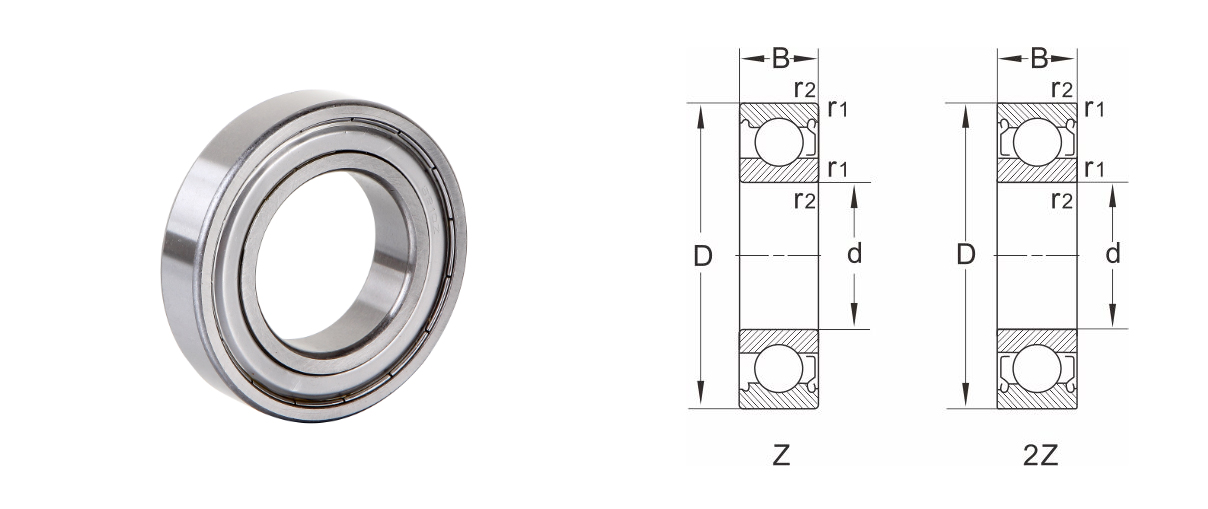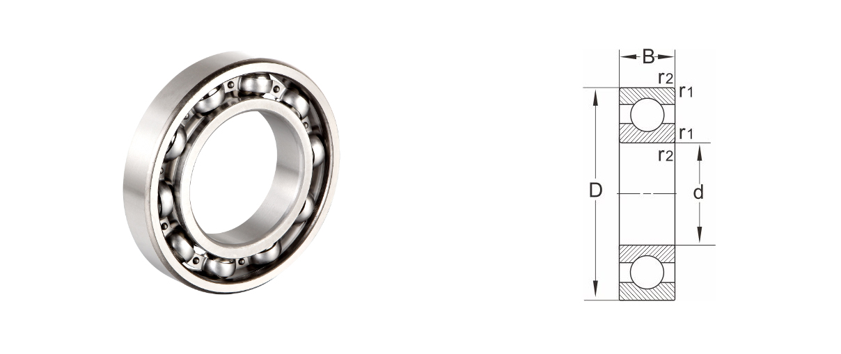d | D | B | r1,r2 Min | Dynamisk belastning Cr | Statisk belastning Cor | Fedtsmøring | Oliesmøring | ||